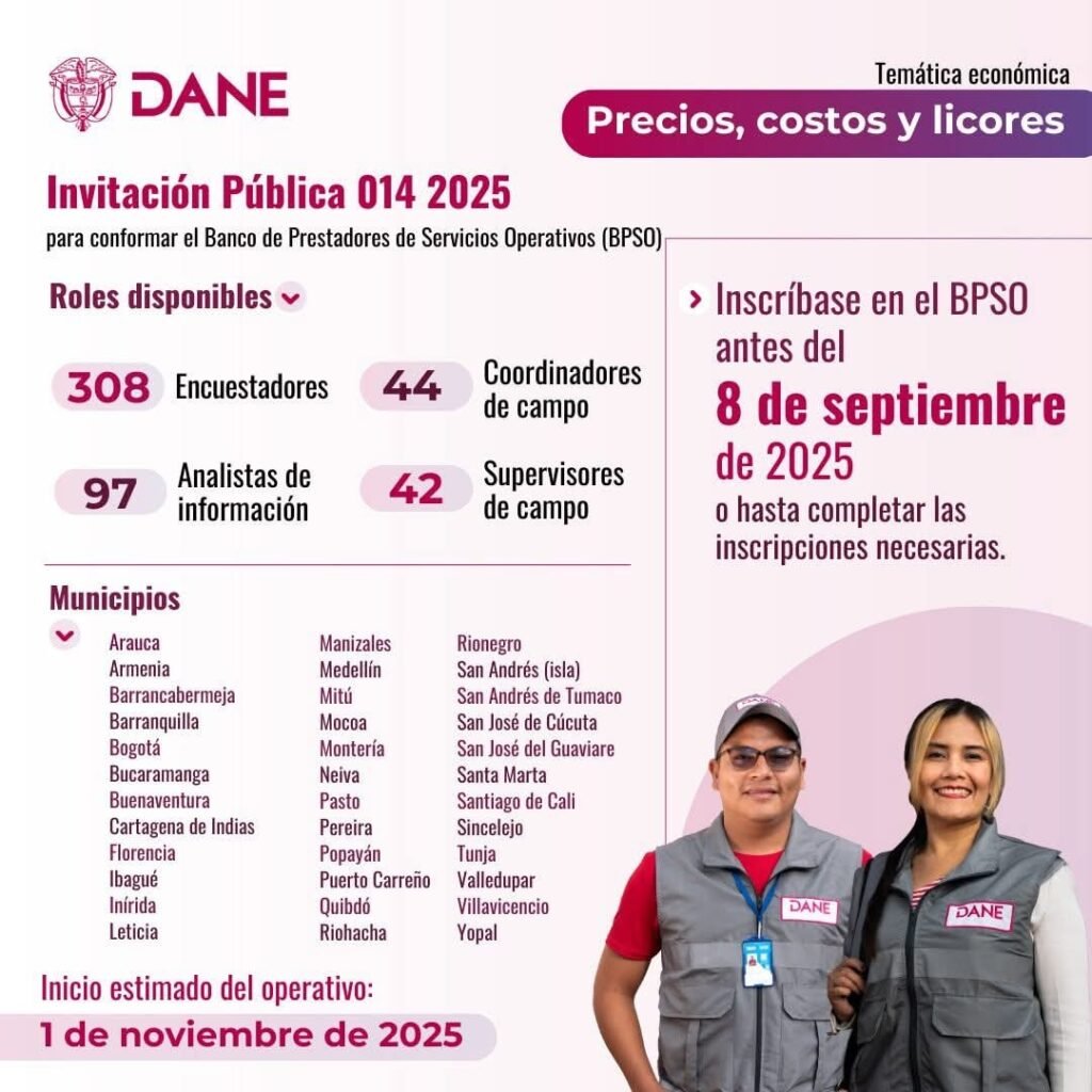 El DANE abre una nueva oportunidad laboral a través del Banco de Prestadores de Servicios Operativos (BPSO). Buscamos 491 personas idóneas para la recolección de información en la temática económica – Precios, costos y licores.